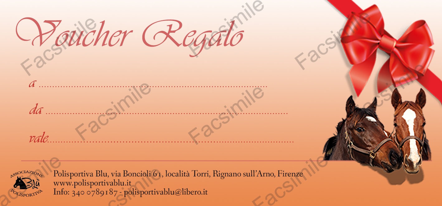 Con i nostri voucher puoi regalare una o più lezioni di equitazione. Il numero delle lezioni e il tipo di abbonamento è personalizzabile e si possono regalare voucher sia a persone che hanno già svolto delle lezioni da noi sia a chi non è mai stato nella nostra polisportiva e si avvicina per la prima volta al mondo dei cavalli.